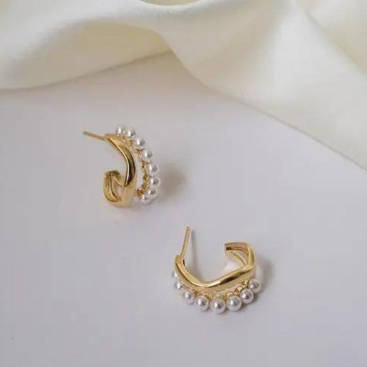 C Shaped Pearl Gold Hoop Earrings
